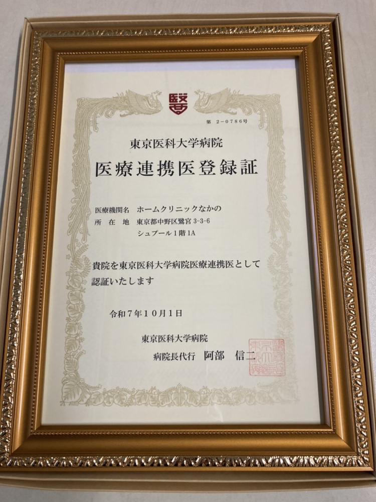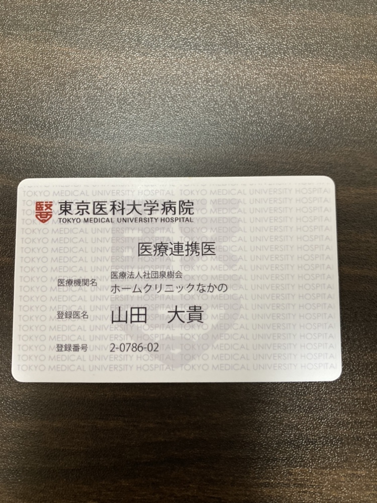 今回正式に東京医科大学病院様に医療連携医としてご登録いただきました。ますます患者様の情報交換やご紹介など、スムーズに、かつ濃密にできればと存じております。お世話になってばかりで大変申し訳ございませんが、東京医科大学病院の先生方、今後もご指導をよろしくお願い申し上げます。